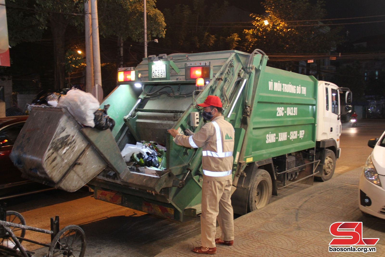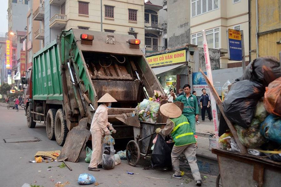Đội ngũ tận tâm: Công nhân thu gom làm việc nhiệt tình, hỗ trợ quét dọn sạch sẽ khu vực tập kết sau khi rác đã lên xe.